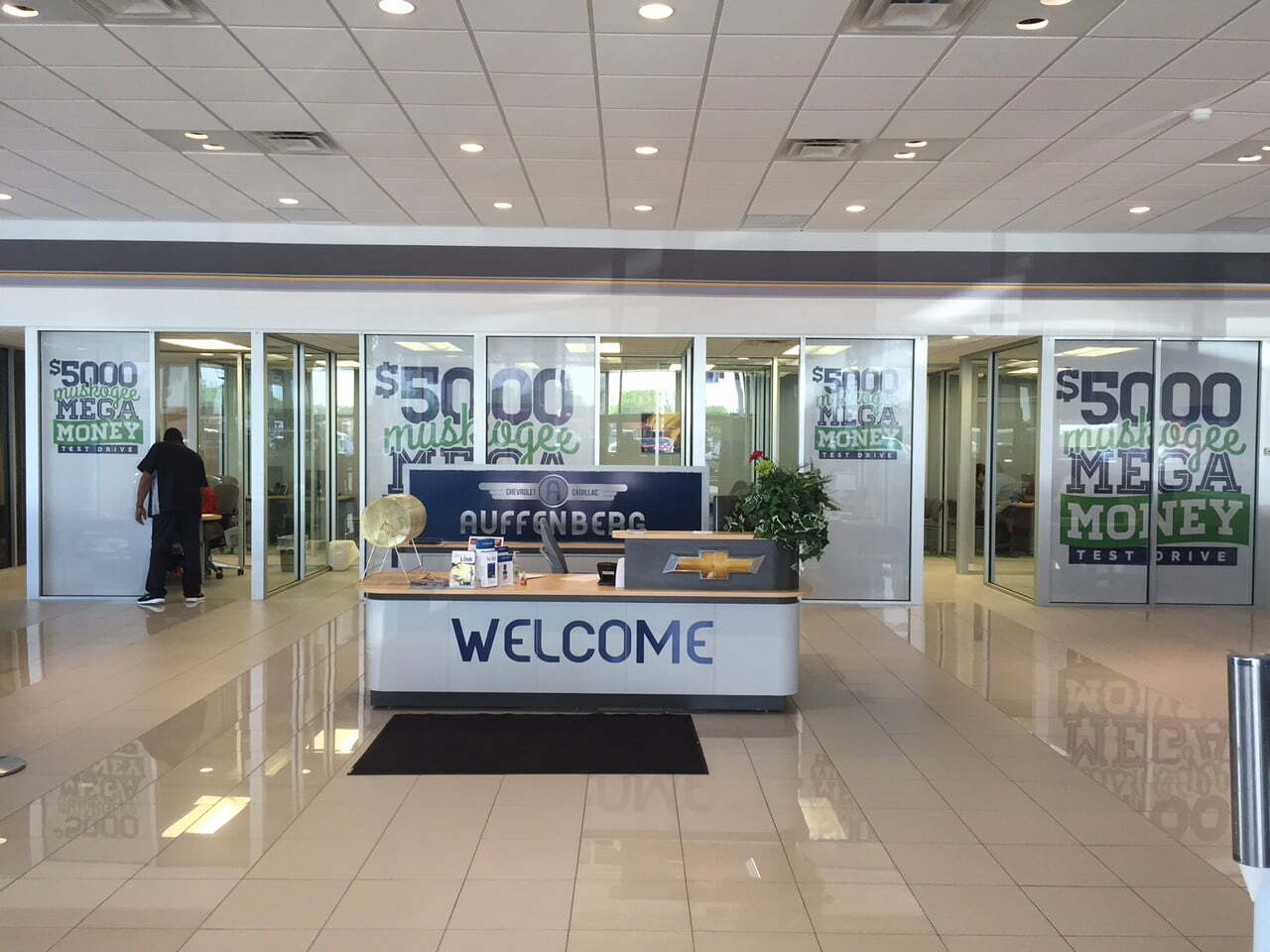Auffenberg Chevrolet Cadillac’s perforated vinyl window sign that says “welcome”. A project sign project done by The Sign Prints of Joplin, MO.